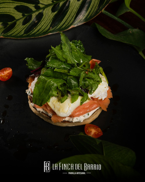 | Esponjoso y recién horneado muffin, untado con queso crema y eneldo, servido con salmón ahumado y huevos pachados. Fluffy, freshly baked muffin, spread with cream cheese and dill, served with smoked salmon and poached eggs. | |||